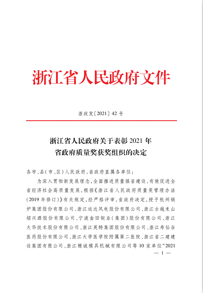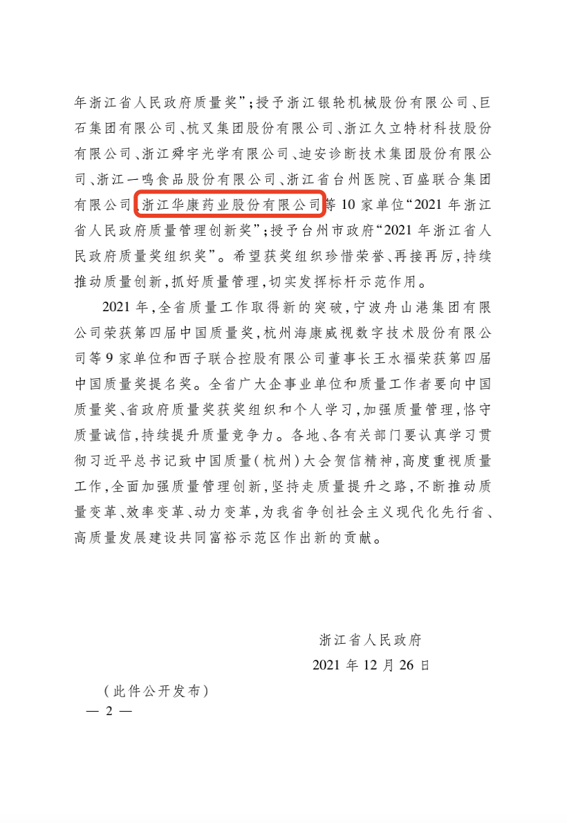 重磅!华康股份荣获“2021年浙江省人民政府质量管理创新奖”!