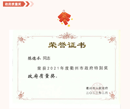 在本次大会上,华康股份被授予2021年度衢州市新增上市企业奖、2021年度衢州市政府特别奖杰出贡献奖三等奖,华康股份董事长兼总经理陈德水同志被授予2021年度衢州市政府特别奖政府质量奖(个人)。