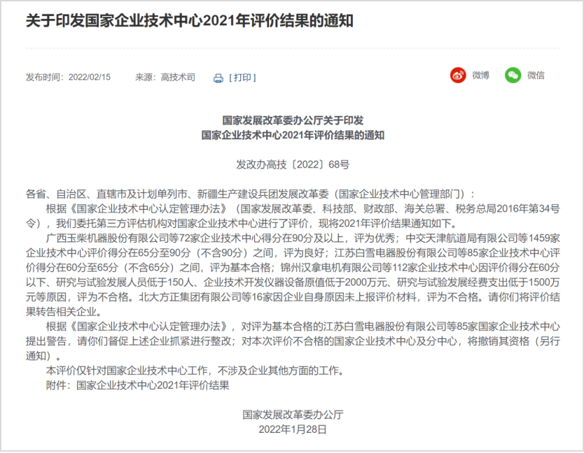 2月15日,国家发展改革委办公厅发布了国家企业技术中心2021年评价结果,华康股份以良好等级顺利通过国家企业技术中心评审。