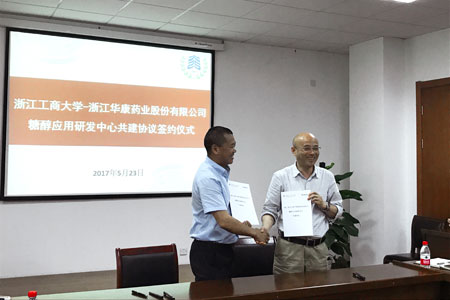 5月23日下午,浙江工商大学与ag捕鱼王官方网站药业股份有限公司在工商大学食品与生物工程学院会议室,共同签订了“浙江工商大学&华康药业糖醇应用研发中心共建协议”。